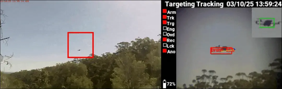 The Katoomba™ K2D is an AI-integrated counter-sensor system, designed to allow law enforcement professionals to defend against nefarious drone use in populated areas, while being compliant with CASA/FAA and ACMA/FCC regulations. The K2D works by temporarily disrupting a drone’s onboard camera, preventing the drone from undertaking photography or filming towards the protected area. Additionally, the K2D enables law enforcement to permanently disable the onboard camera, preventing the drone operator from utilising the first-person view (FPV) camera for precise, remote navigation, preventing nefarious actors from undertaking their objective. On the occasion of camera disablement, the drone operator has the option to ‘return to home’, utilising onboard GPS/IMU guidance.
